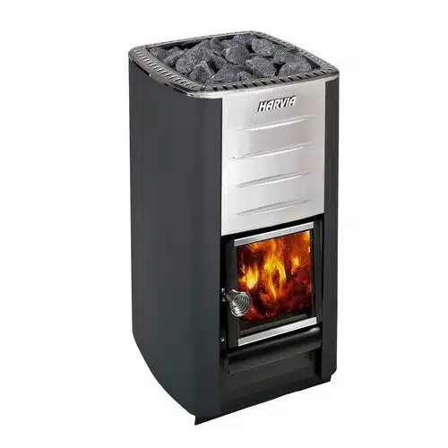 Le Harvia M3 est équipé d’une porte vitrée, permettant à la lueur chaude du feu de compléter l’atmosphère du sauna. La couleur du poêle à bois est un noir graphite élégant et il est équipé d’un déflecteur d’air en acier inoxydable. Le poêle à bois M3 peut être équipé d’un chauffe-eau de type tuyau.