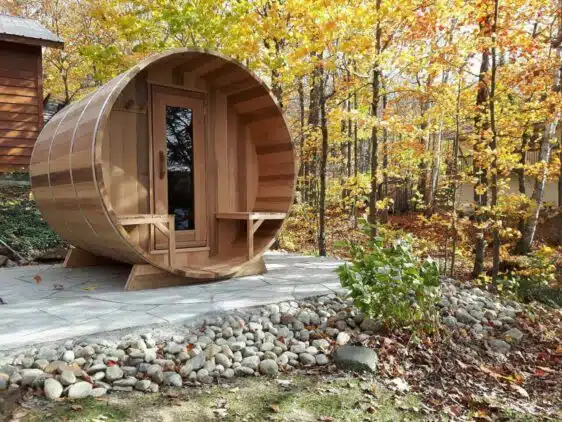 Sauna tonneau extérieur en cèdre rouge, avec bancs.